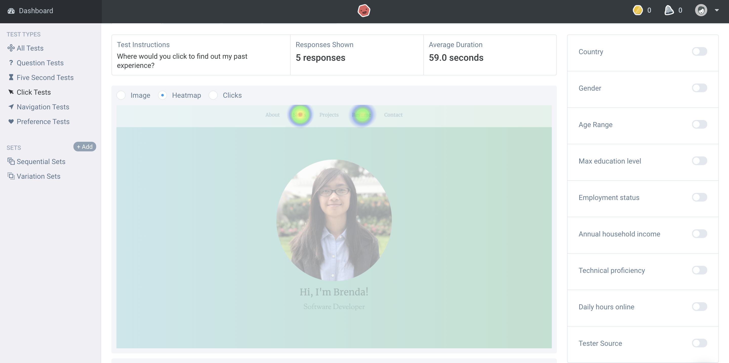 User tests were done on UsabilityHub.com. I formulated which tasks I wanted to test ahead of time and sent the link to the tests to several users. I made a question test and a click test. I ran a question test because I wanted to ask questions based on the whole portfolio itself, for example the aesthetics, which click test does not cover. I ran a click test because it helped understand how users interact it with portfolio, given a task. Some of the click tests I ran were social media click test, resume click test, and experience click test.