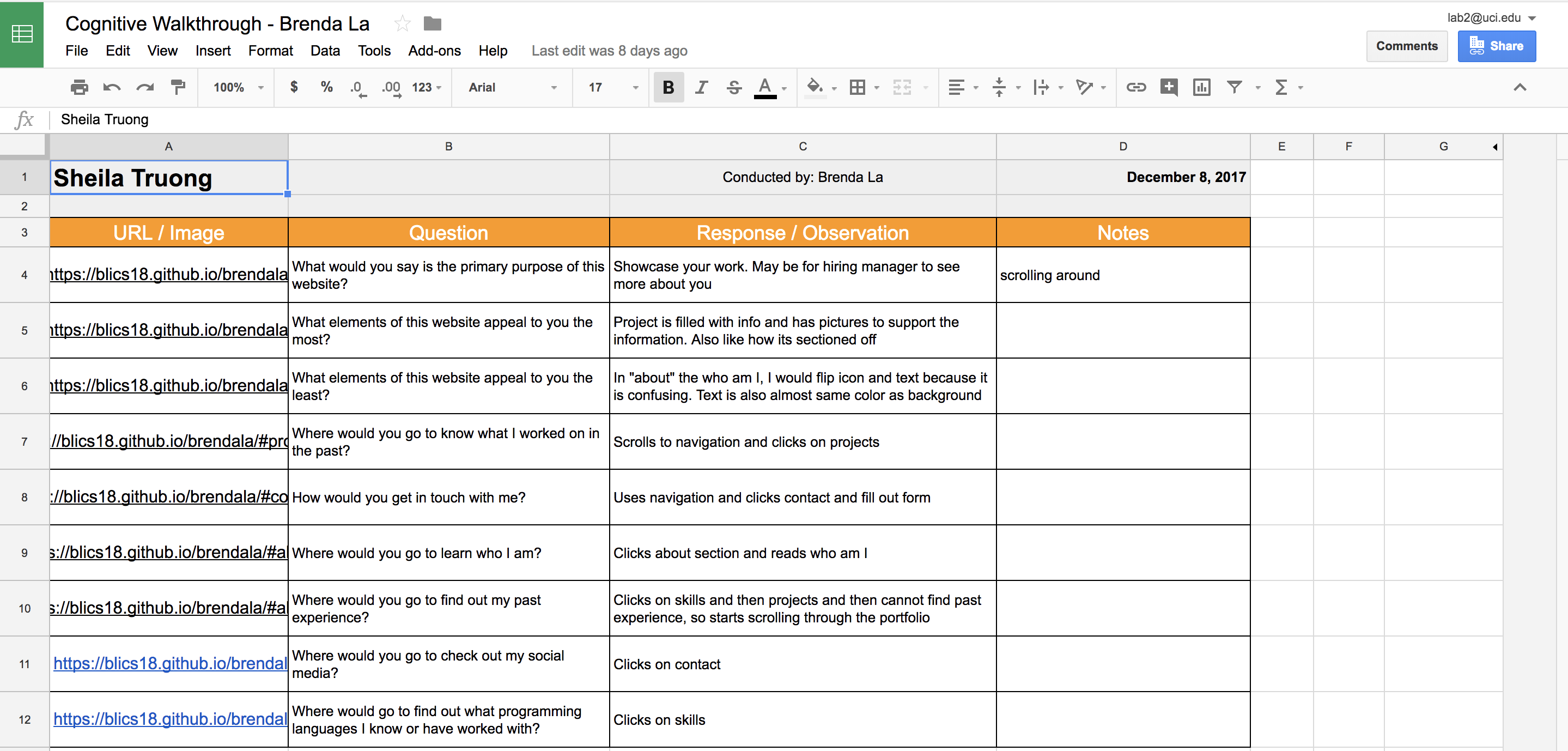 A cognitive walkthrough is a way to test the features implemented with experts. It is an in-person walkthrough of the portfolio. I sat down with the people I interviewed and asked them some questions and asked them to perform certain tasks on the portfolio I implemented. I took notes and wrote down their responses. It helped me see how they responded to the interface and what their thoughts were for each task.