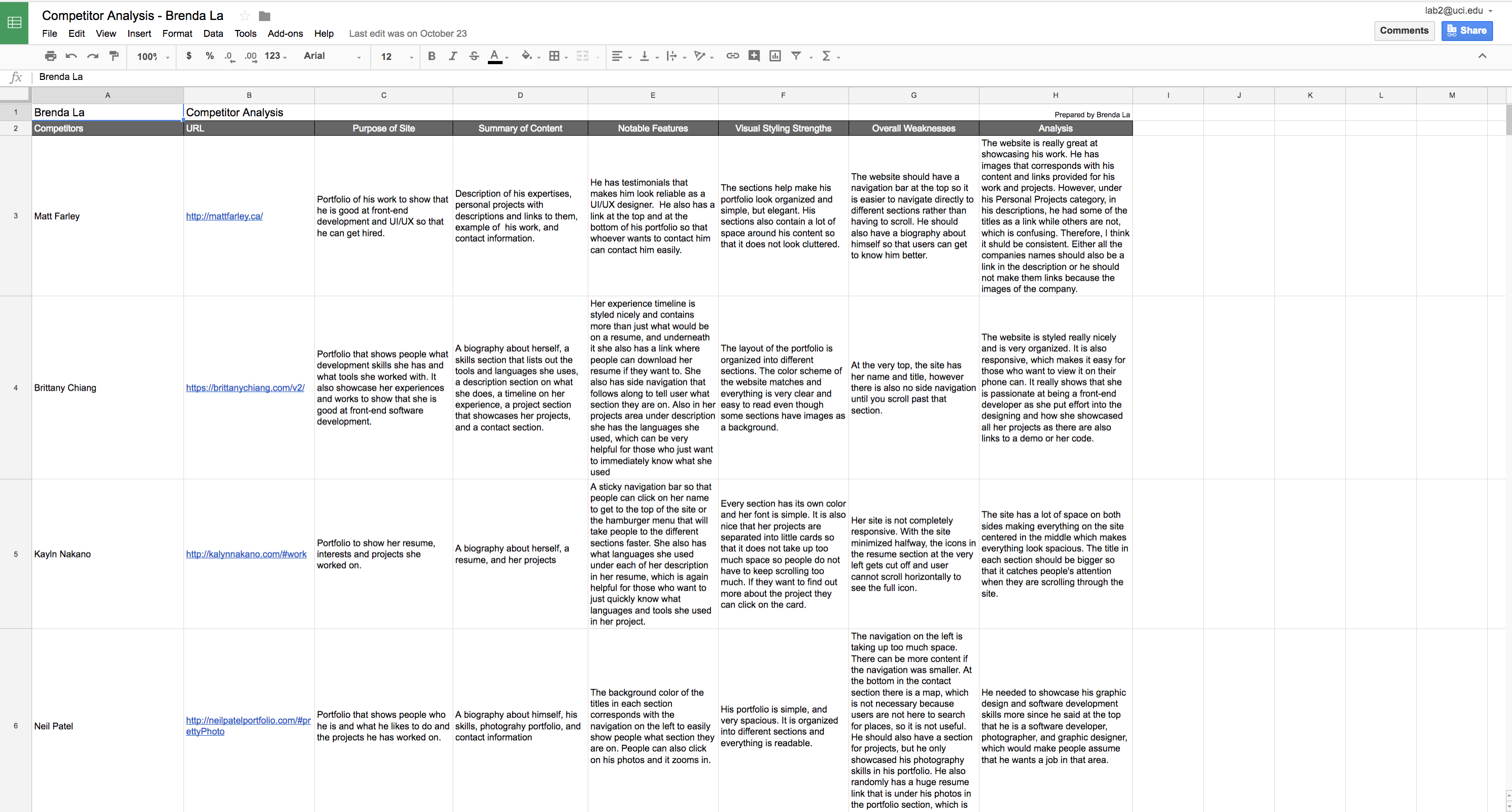 A competitor analysis is a chart that includes the name of the competitor, link to the competitor's portfolio, purpose of the site, summary of site's content, notable features of the site, visual styling strengths of the site, weaknesses of the site, and an analysis of the site. To look for competitors, I went online and found some portfolios by software developers and UI/UX designers. I chose to review these certain competitors because I thought their portfolio was great and also the career they are in is the career I would also want. Therefore, I want to make my portfolio better than theirs. After I found a couple of portfolios, I analyzed each portfolio and wrote down some good and bad features their portfolios contained. This helped me figure what would be helpful or not helpful in my portfolio.