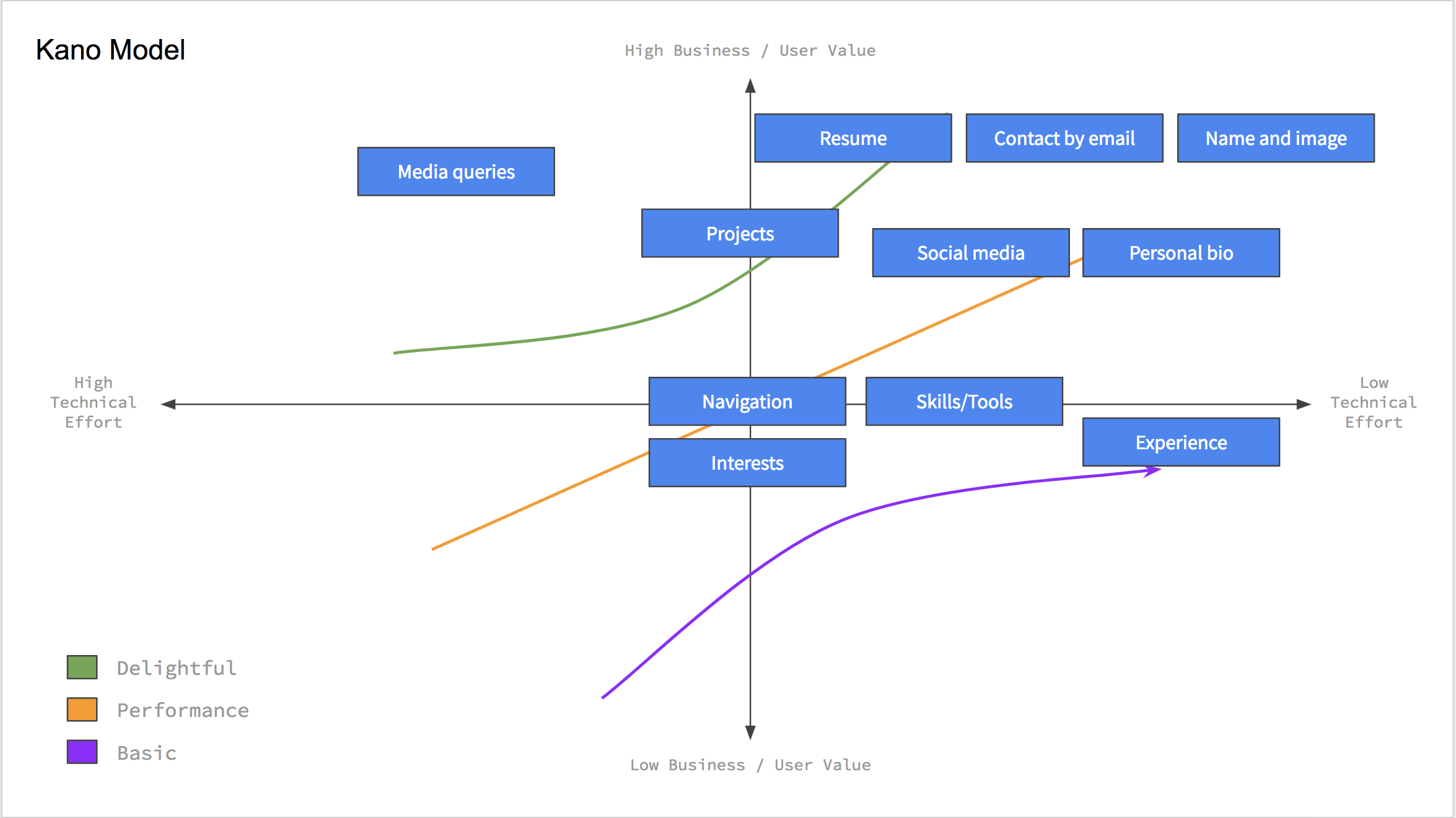 There are two forms of feature prioritization. The first form of feature prioritization is a line that that shows the features that are low priority to high priority. The second form of feature prioritization is known as the Kano Model which shows where the feature lies based on technical efforts, user values, and business values. I was able to figure out where the features lie based on the total values calcuated from the feature value matrix. This helped me visualize which features are more important than others. So when I was builidng the interface, I started with the feature that was the most important and then continued with the next important feature and so on.
