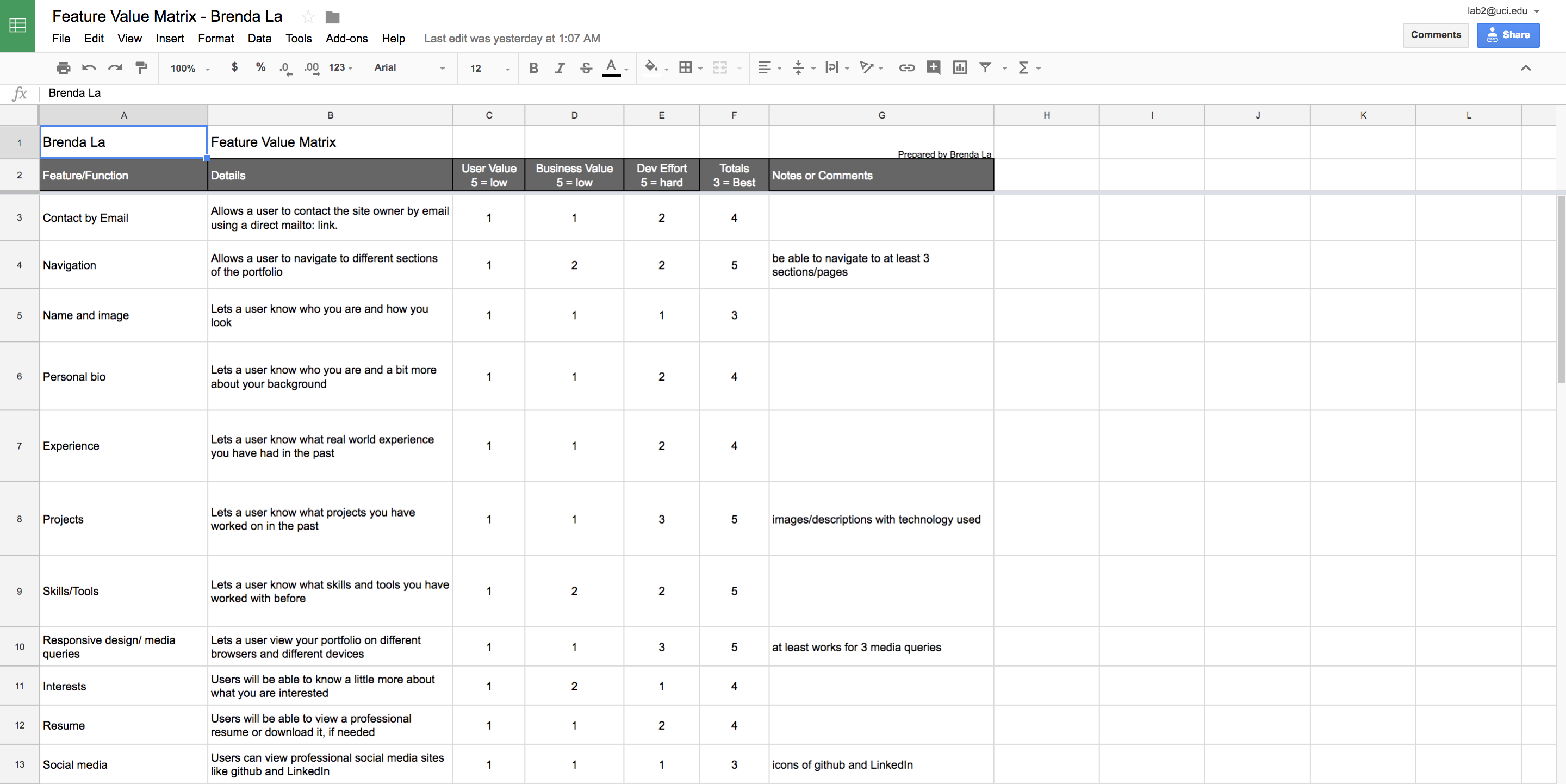 A feature value matrix is a chart that includes features that would be included in a portfolio and a description about each feature. For each feature there is a value, five being the lowest and one being the highest, that would then be assigned based on the user value of the feature, business value of the feature, and development effort of the feature a value. After I found out what users want and I viewed other portfolios, I wrote down features I would include in my portfolio. Features I included are contact by email, navigation, name and image, personal biography, experience, projects, skills, responsive design, interests, resume, and social media. I added a contact section so that they are able to contact me. Navigation helps users navigate around my portfolio. I added my name, image, and personal biography so that users know who the author of the portfolio is, how I look like, and it helps user know a little more about me. The experience, projects, and skills section are used to showcase my skills and work. Responsive design is an important feature because I need to make my site responsive so that it can be viewed on different devices. The resume section is helpful for those who want to look over my resume and download it if they want to. Lastly I selected social media because users can also connect with me on social media.