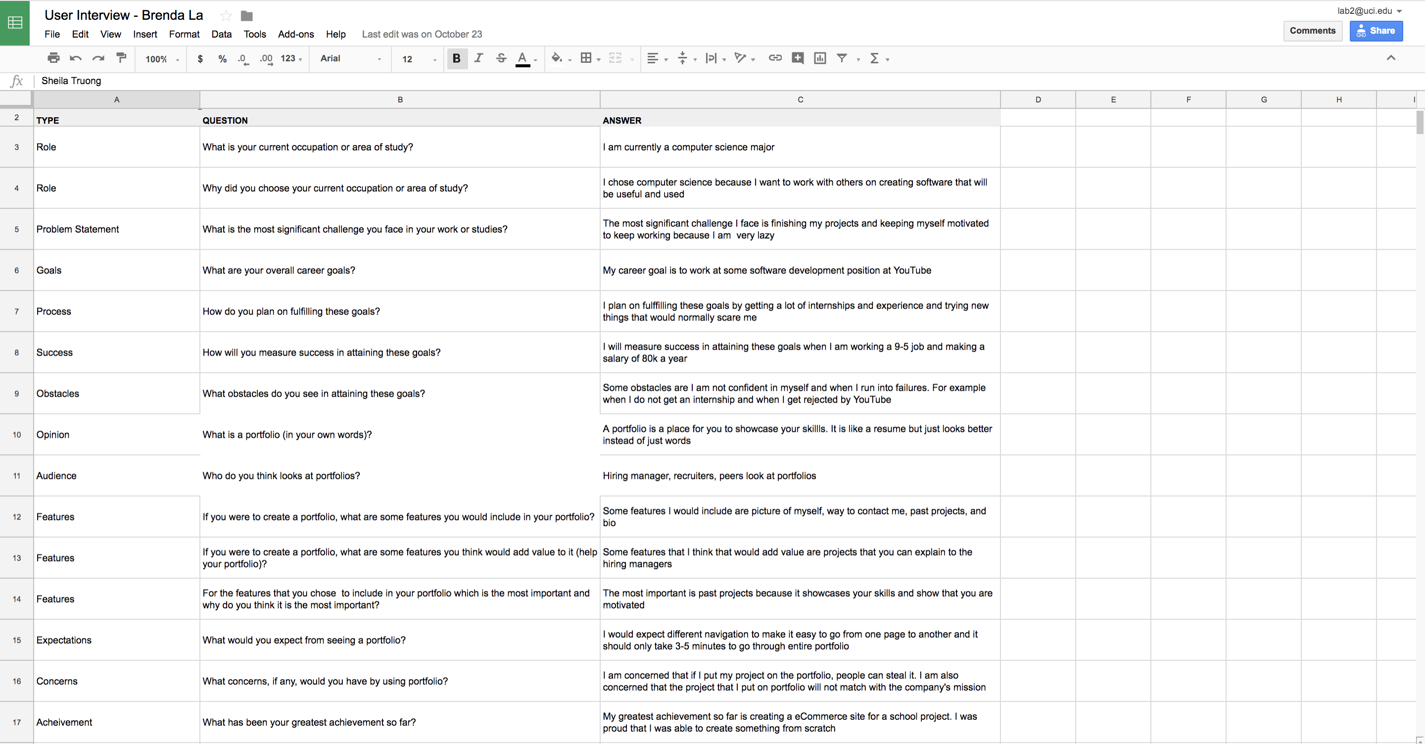 Before even starting the portfolio, I had to interview different users because it is important to understand who my users are and what they would want to see on a portfolio. I interviewed my colleagues and software developers who could be looking at portfolios during interviews. The user interviews included questions like what are their goals, how do they plan on achieving the goals, what is a portfolio to them, what features they would include in a portfolio, and etc.
