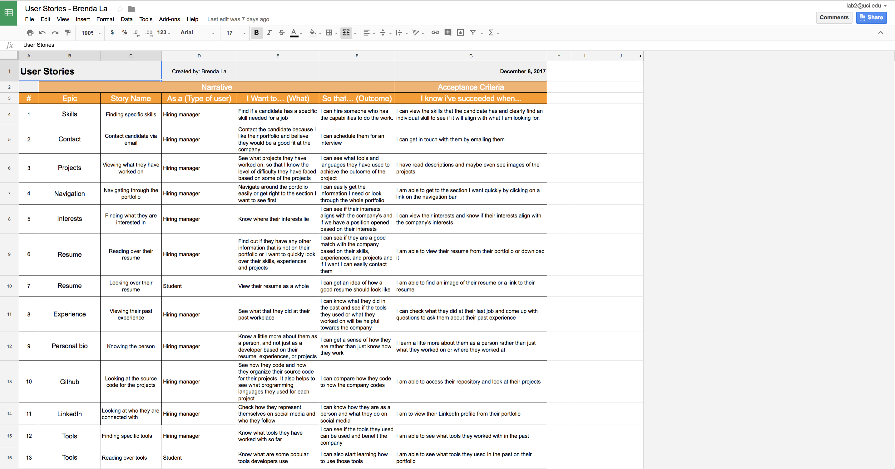 User stories contain stories on how different users would use the features. It helped me understand what users want and need to accomplish by engaging with the interface. It also helped me understand why users needed specific content and features. For every user story, I came up with the story by putting myself in the user's shoes. I thought about the user and what they would be looking for and how they would interact with the interface.